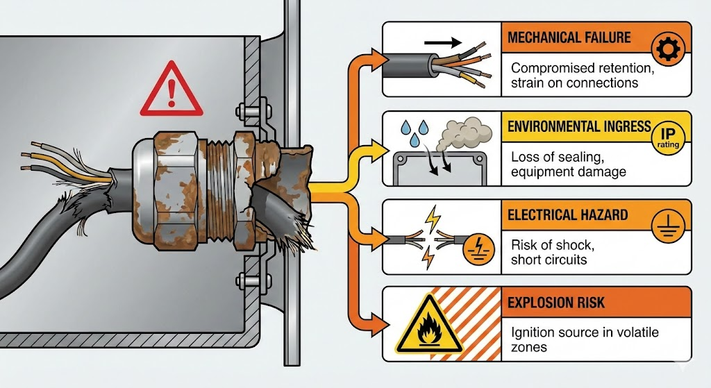 The image below shows how a failed cable gland can trigger multiple industrial risks, including mechanical failure, environmental ingress, electrical hazards, and explosion risk in hazardous zones.