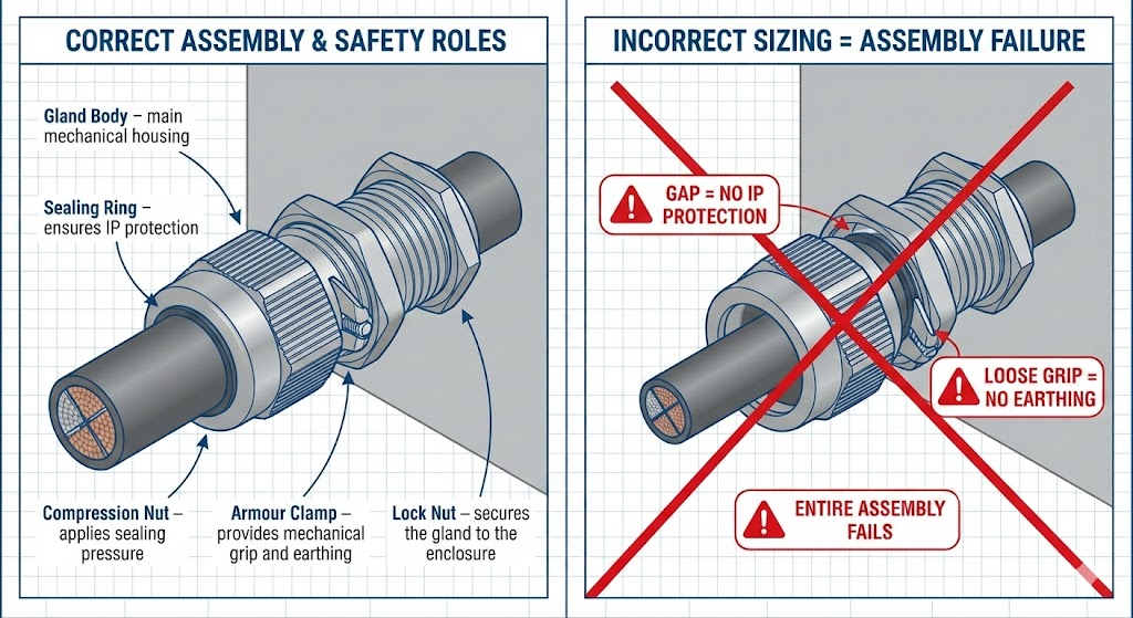 Incorrect cable gland sizing is a silent risk that affects IP rating, mechanical integrity, and explosion protection. Even certified products fail if the size is wrong.